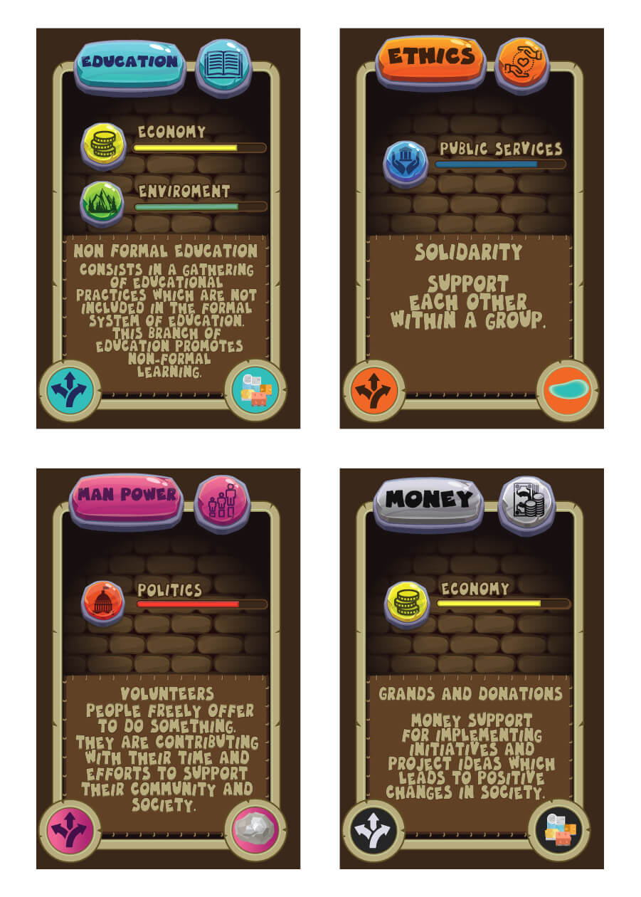 Designed by AddArt, EU-Topia was the end product of the “Peace by Piece” Training Course hosted by the Erasmus+ EU Programme in Poland. The game has a strong educational aspect and focuses on the value of peace. Players are called to work as a team and attempt to maintain peace and stability in the EU-Topia nation, as various factors push the country towards war and disorder. The game has been published and distributed as part of the educational process in schools of the war-torn countries of Palestine and Ukraine.